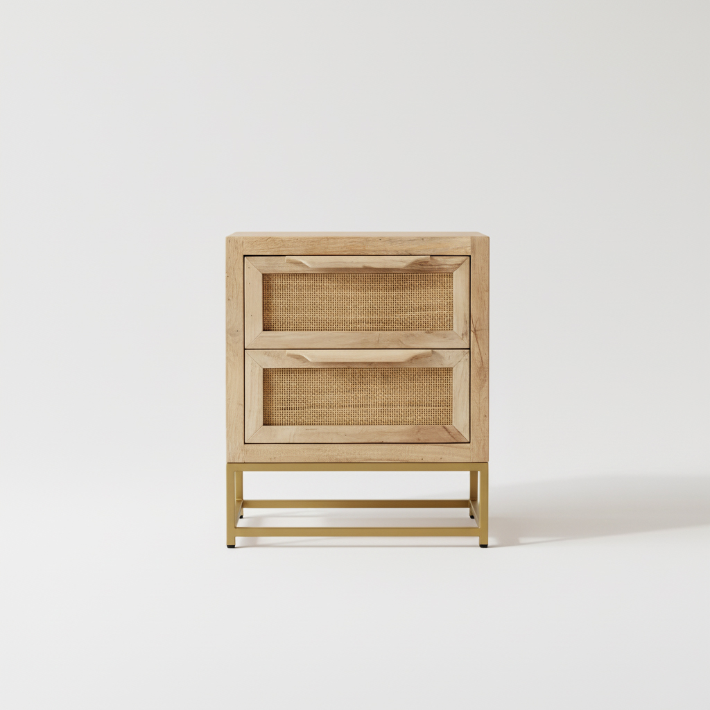 Crafted from beautiful wood with the natural grain still visible, this bedside table features two spacious drawers fronted by woven flat rattan. It is perched atop a sturdy brass-coloured iron frame, allowing for additional storage underneath. Our simply stylish Flat Rattan Webbing Bedside Table will slot easily into a versatile New Neutral or pared-back Scandinavian-inspired aesthetic.