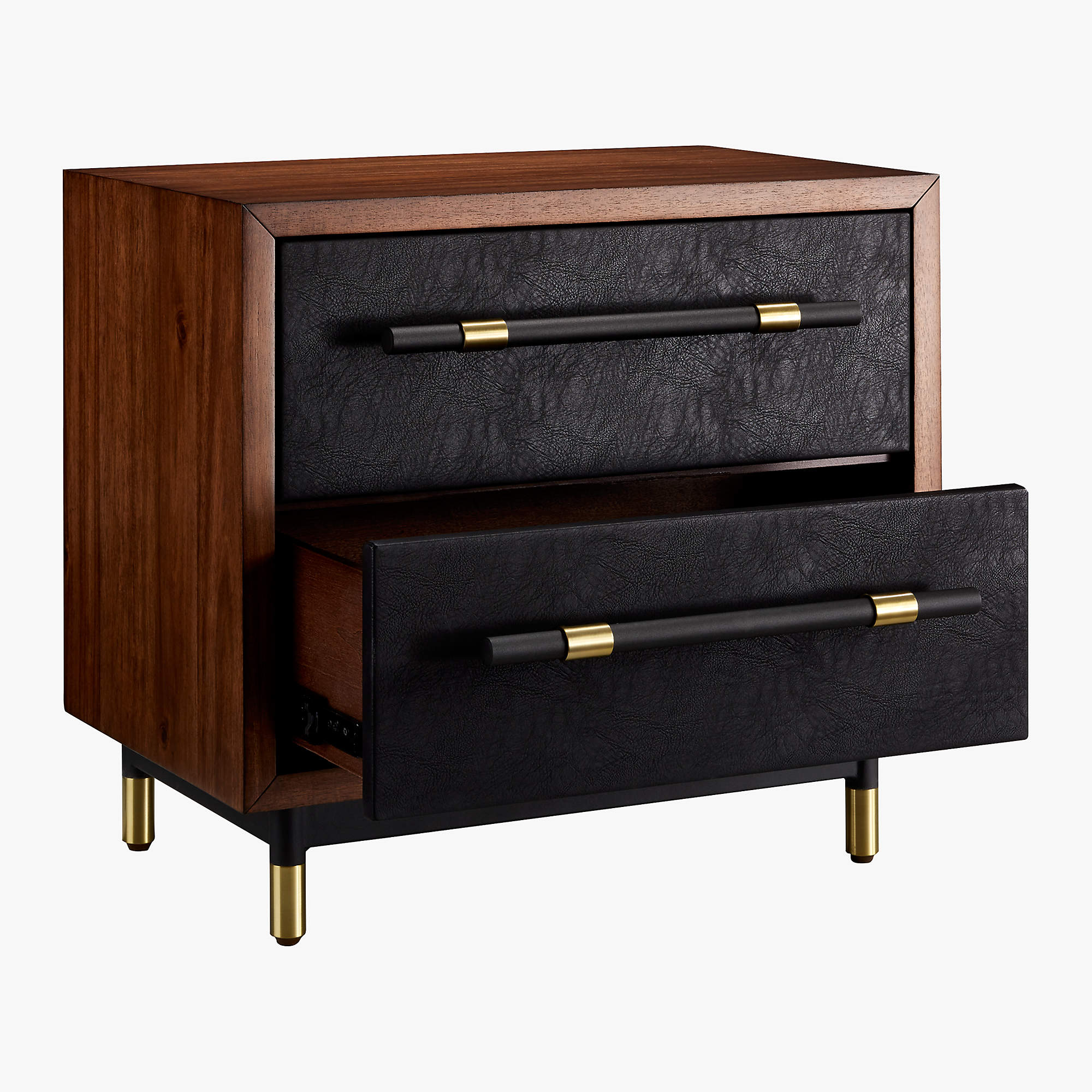 Minimal wood frame holds two deep drawers fronted with beautiful black leather. Slim black wood handles with brass detail stretch nearly the length of the drawers. Inset cylinder-like legs clad in brass create a clean, elegant line.