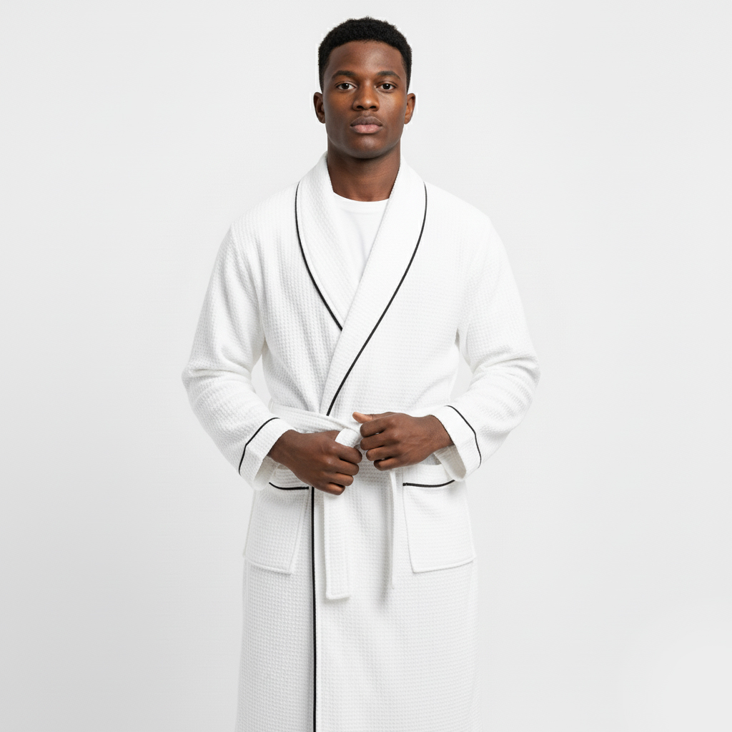 Indulge in the ultimate luxury with our shawl collar bathrobe, featuring a charming pineapple pattern, premium cotton fabric, and elegant piping. Designed for lounging, post-shower comfort, spa relaxation, travel, or even as a thoughtful gift for men and women, this bathrobe effortlessly combines style, absorbency, and versatility. Perfect for spa-goers, hotel clients, and everyday luxury seekers in Lagos, Nigeria.