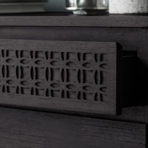 This 3 Door 2 Drawer Sideboard features a stunning matte black charcoal finish, where the different grains in the mixed timbers stand out in the light and catch your eye with this beautiful detail.