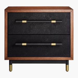 Its boxy frame is softened with curved corners. With plenty of storage – three drawers and a cupboard – the doors are finished with simple brass handles that elevate the chest of drawers and add a gentle touch of luxury to the industrial style.